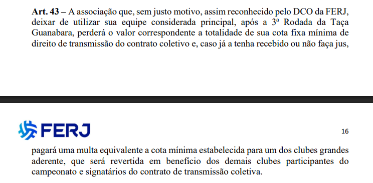 De acordo com o Artigo 43 do regulamento da FERJ, clubes que deixarem de utilizar sua equipe considerada principal, sem justo motivo reconhecido pelo DCO, após a terceira rodada da competição, estão sujeitos a sanções severas.