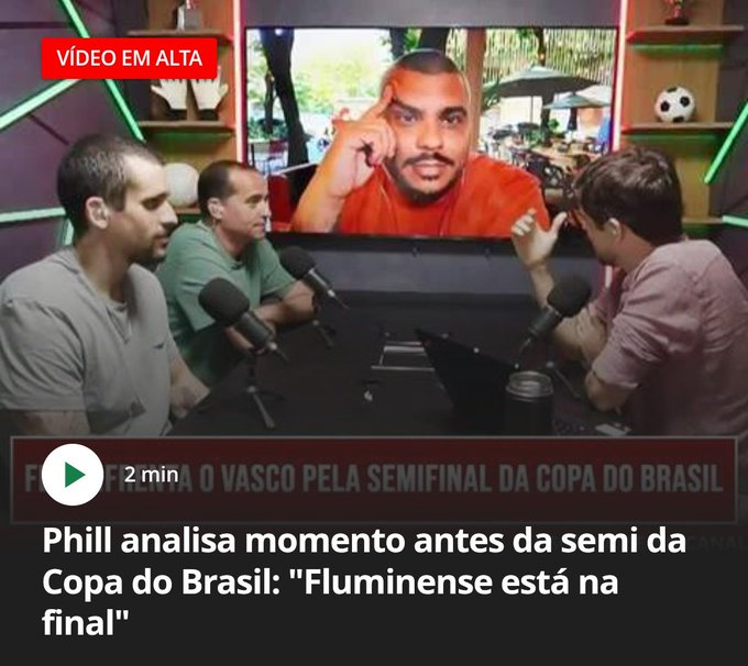 Outro influencer, Phill, também cravou que o Fluminense já está garantido na final da competição. Em outro corte, ele brinca dizendo que, se não tivesse prometido levar o filho ao segundo jogo, tiraria férias para não assistir ao clássico.